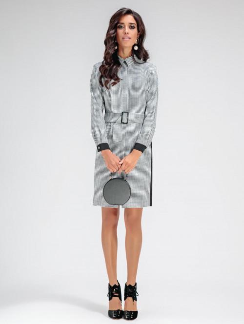 Платье полуприлегающего силуэта, с центральной потайной застежкой застегивающаяся на петли и пуговицы, полочка с отрезным бочком и нагрудной вытачкой, в шве обработан карман, спинка с талиевыми вытачками, горловина круглая, воротник отложной на стойке, рукав втачной оканчивающийся притачной манжетой, застегивающаяся на петлю и пуговицу, по низу рукава заложены две мягкие складки, манжета и бочок из однотонной ткани, в боковом шве обработаны разрезы, без подкладки, дополнением служит, пояс, застегивающийся на пряжку. Длина по спинке 96 см, длина рукава 60 см.