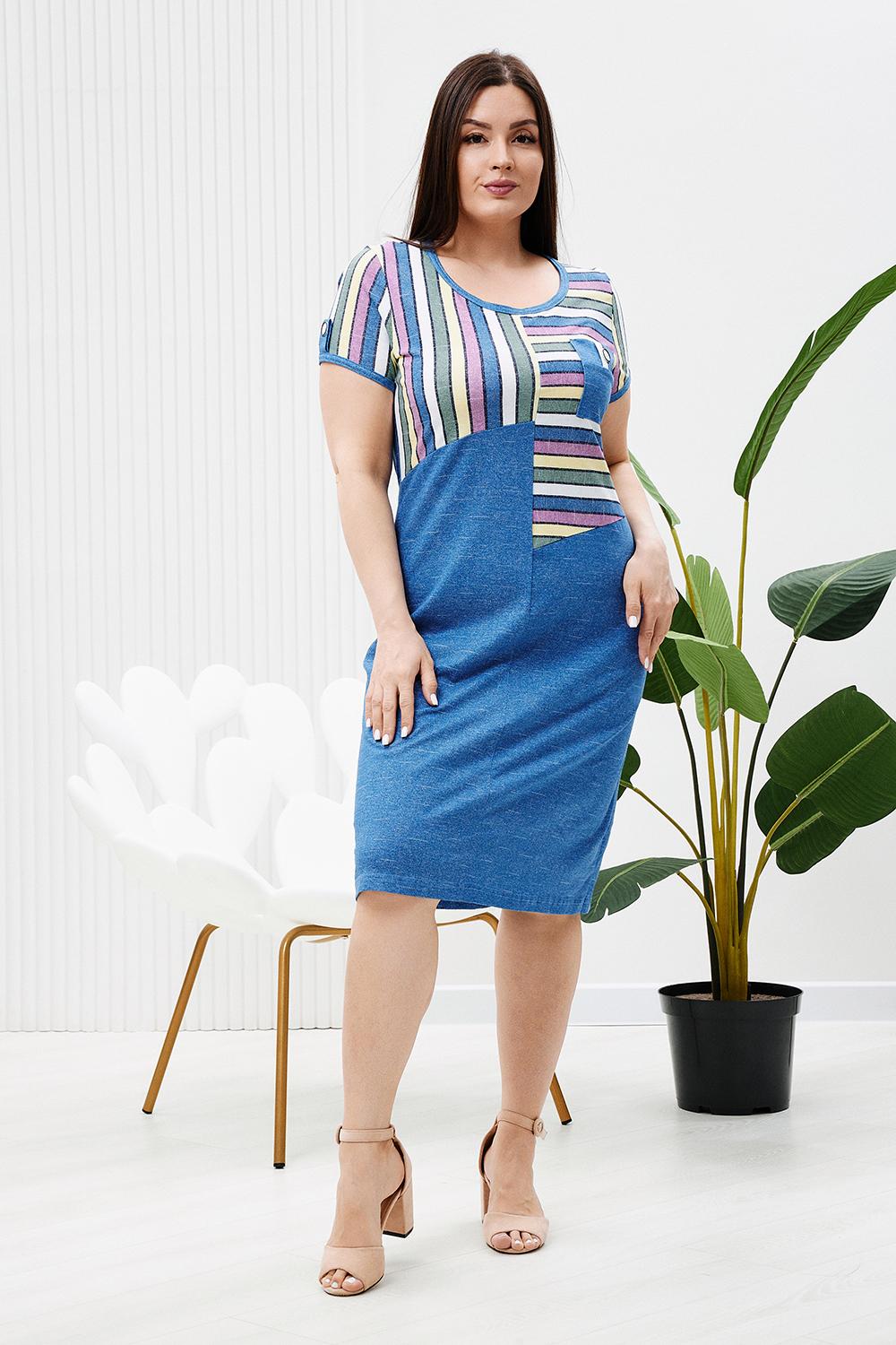 Платье женское полуприлегающего силуэта из кулирки. Перед платья имеет асимметричный крой, нагрудный карман. Спинка на кокетке. Рукав короткий.