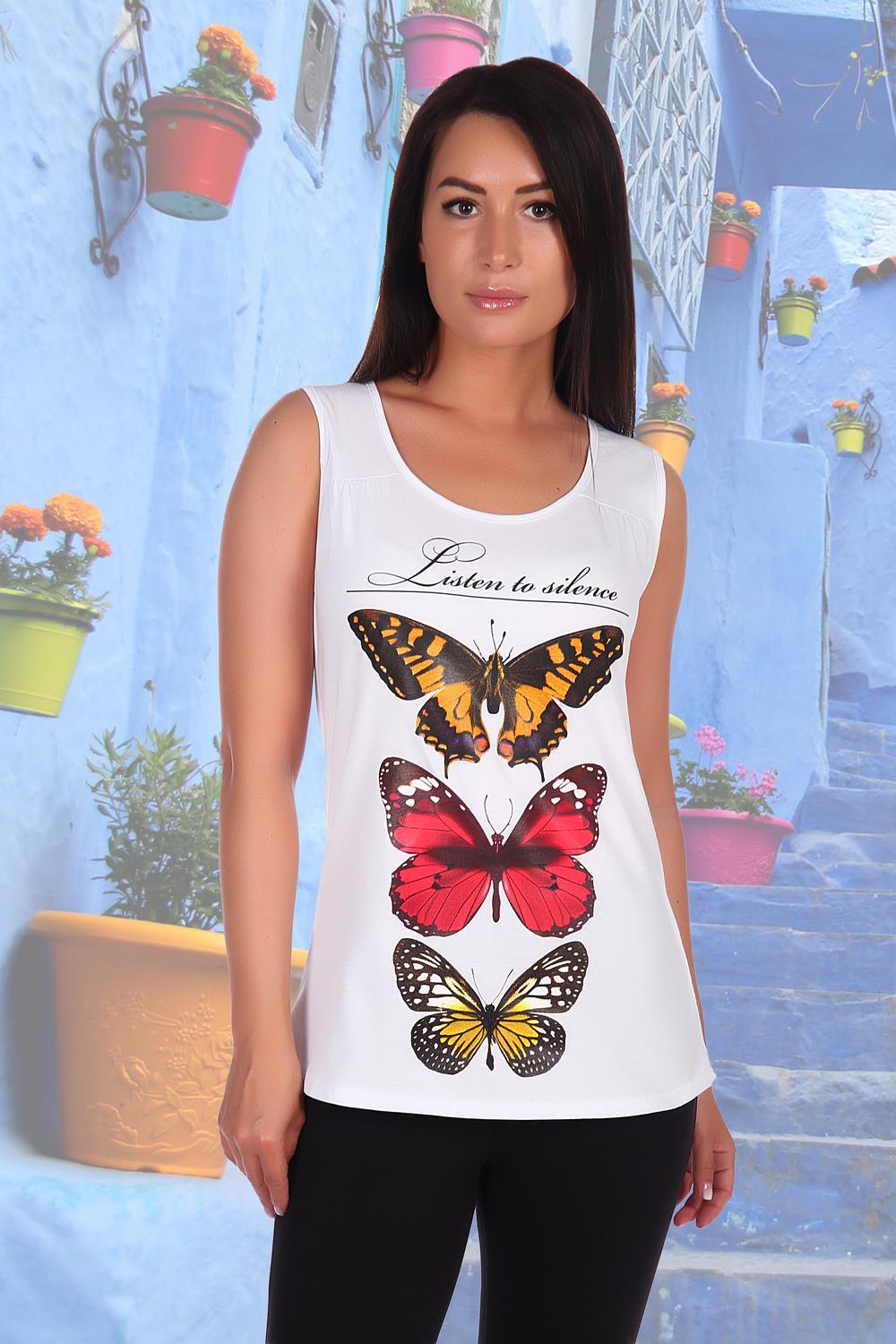 Майка женская с красивым принтом "бабочки" и с перепадом длины. Ткань: кулирка. Состав: 100 % хлопок.