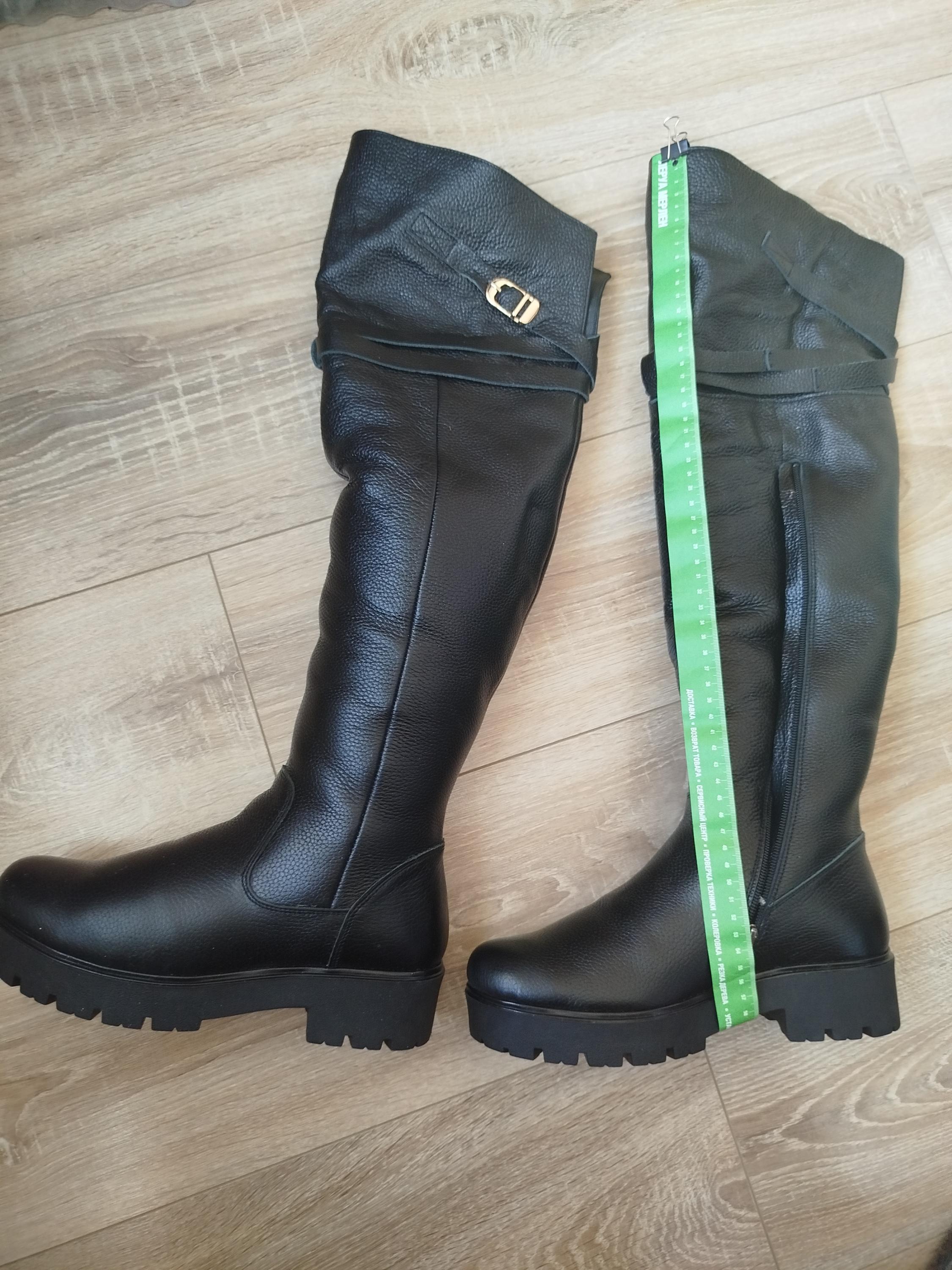 Новые кожаные сапоги-ботфорты натуральная кожа, натуральный мех по всей высоте кроме отложного кожаного отворота, производство Италия, на ногу с узкой голенью.
