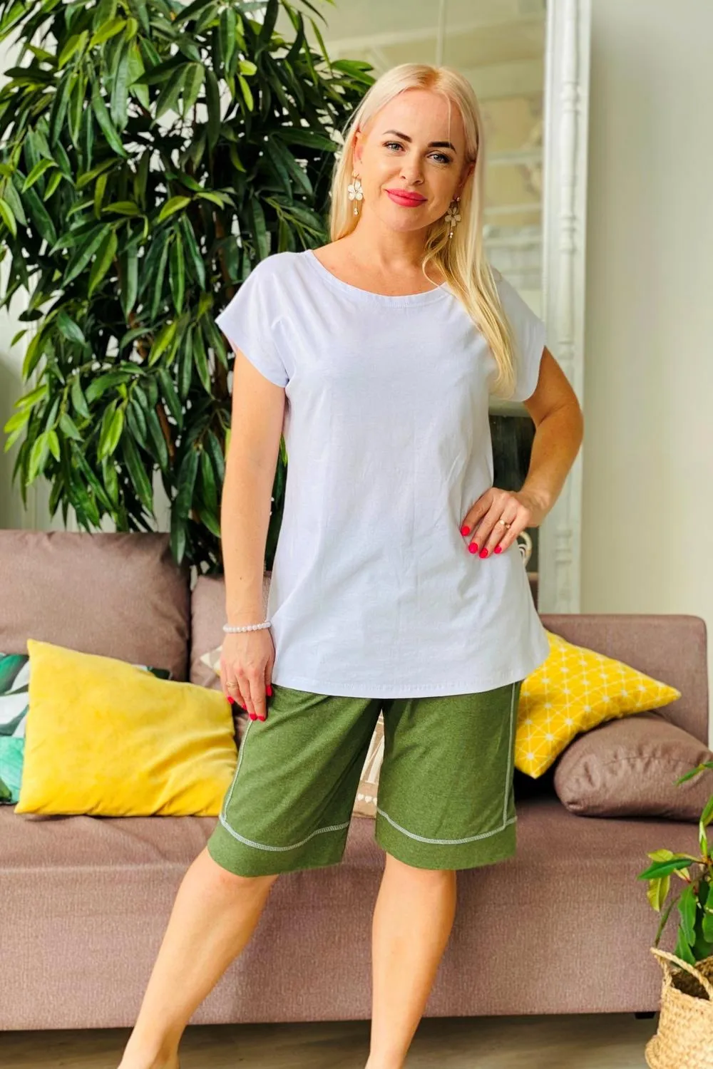 Широкие, прямые, длиной ниже колена, на эластичном поясе, с карманами, со вставкой вдоль боковых швов. Низ шорт обработан манжетом. Спереди по шву притачивания пояса заложены складки. Вход в карман шорт обработан бейкой из основного полотна.
